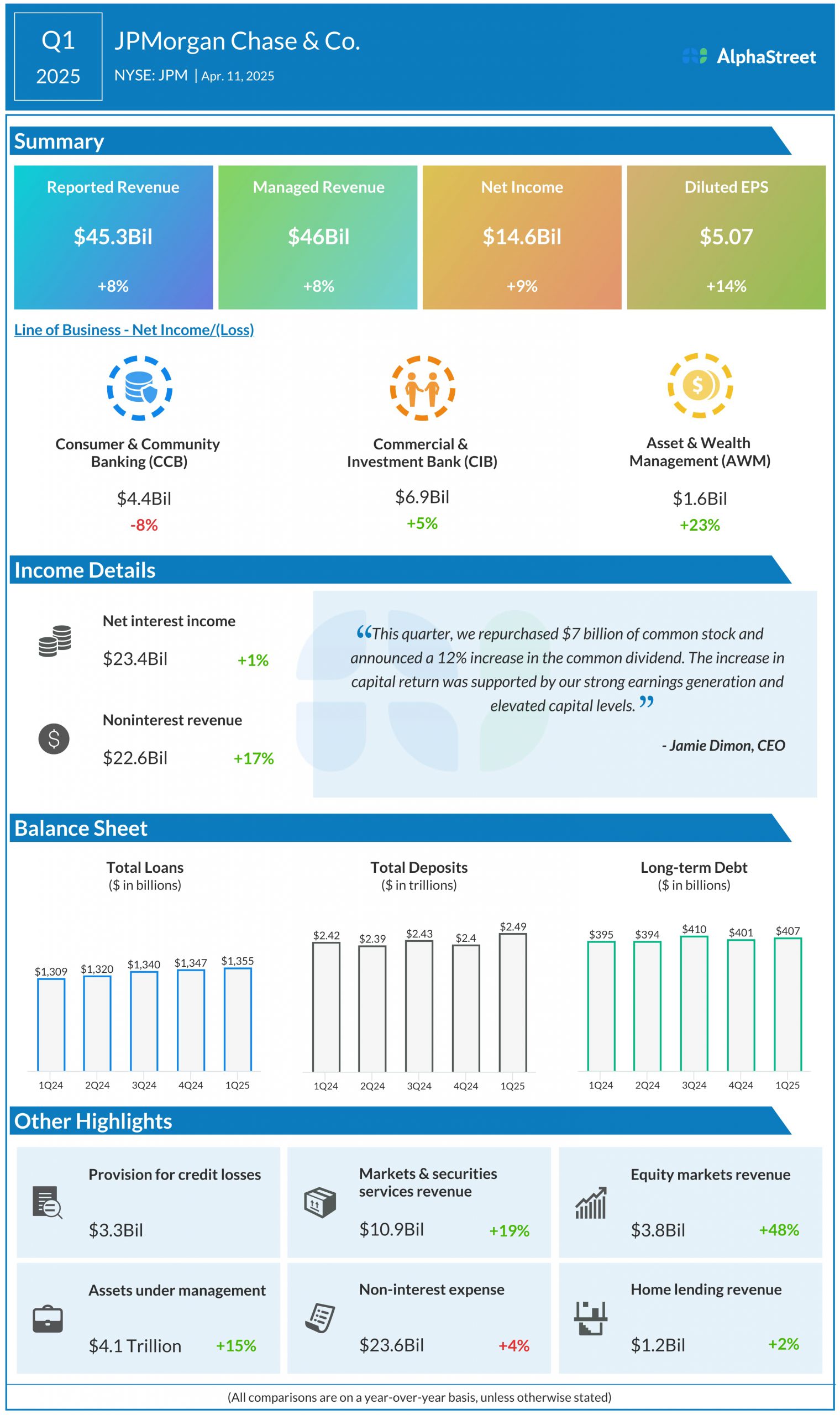 “The economy is facing considerable turbulence (including geopolitics), with the potential positives of tax reform and deregulation and the potential negatives of tariffs and “trade wars,” ongoing sticky inflation, high fiscal deficits and still rather high asset prices and volatility. As always, we hope for the best but prepare the Firm for a wide range of scenarios.”Jamie Dimon, CEO, JPMorgan