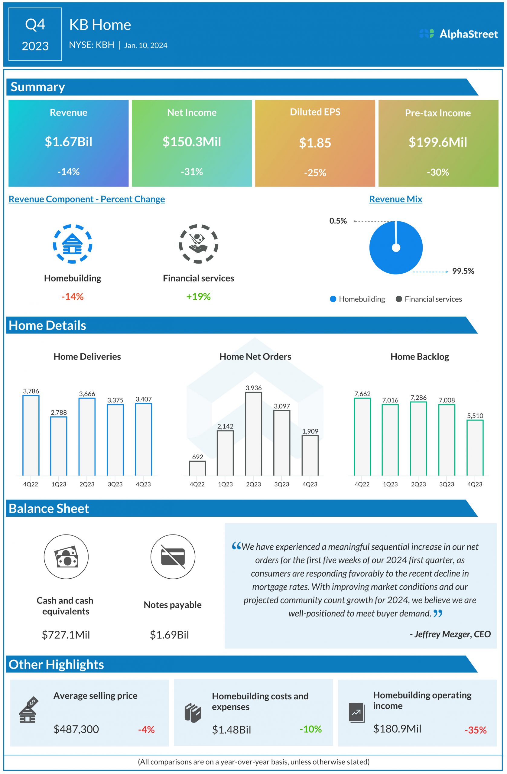 KB Home (NYSE: KBH) reported revenues of $1.67 billion for the fourth quarter of 2023, compared to $1.94 billion reported in the same period a year ago.