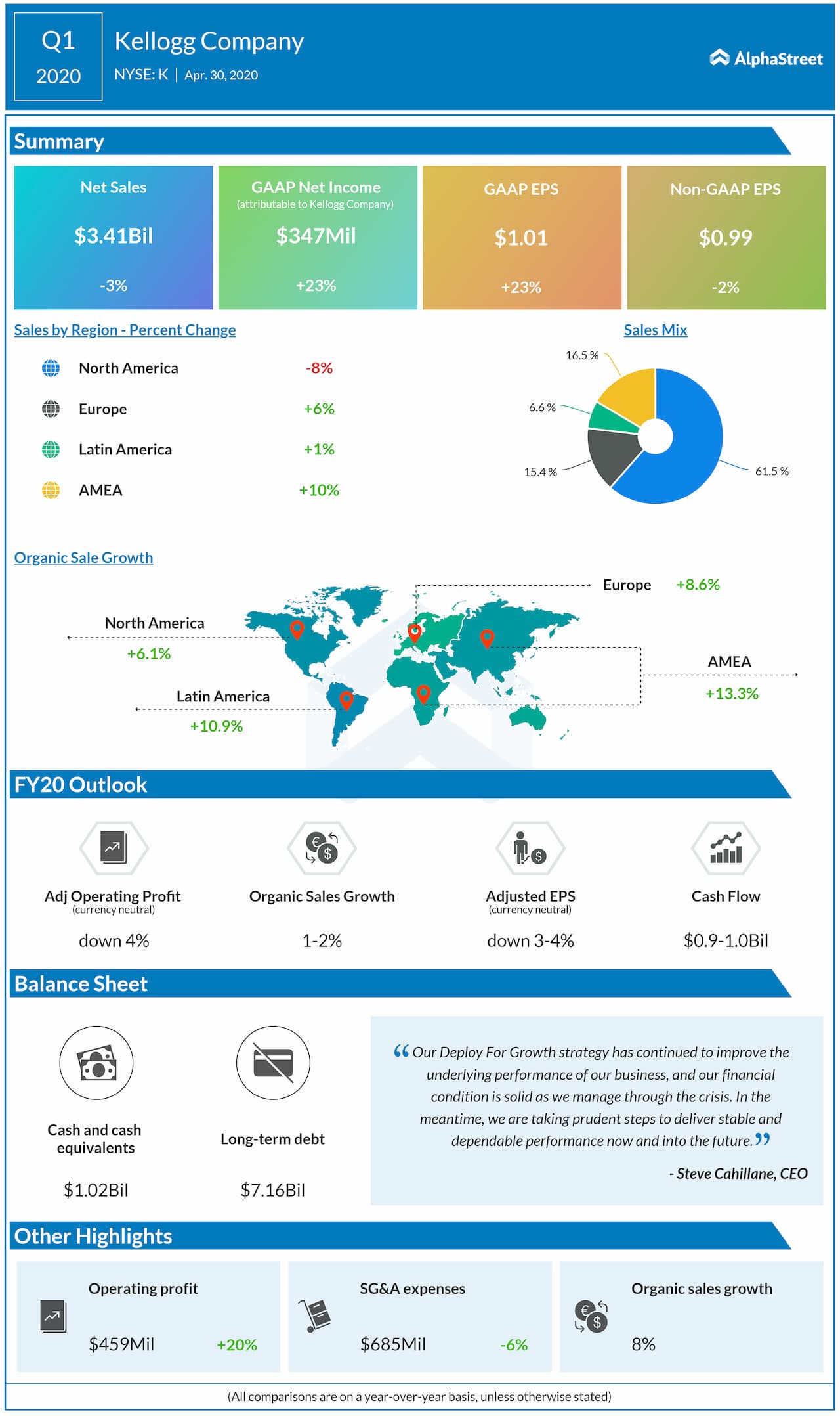 Kellogg affirmed its full-year financial guidance, with sales and profit delivery shifting toward the first half of the year. Organic net sales are expected to grow 1-2% from last year while adjusted earnings per share, on a currency-neutral basis, are anticipated to fall by 3-4% as the absence of results from divested businesses more than offsets growth in the base business.