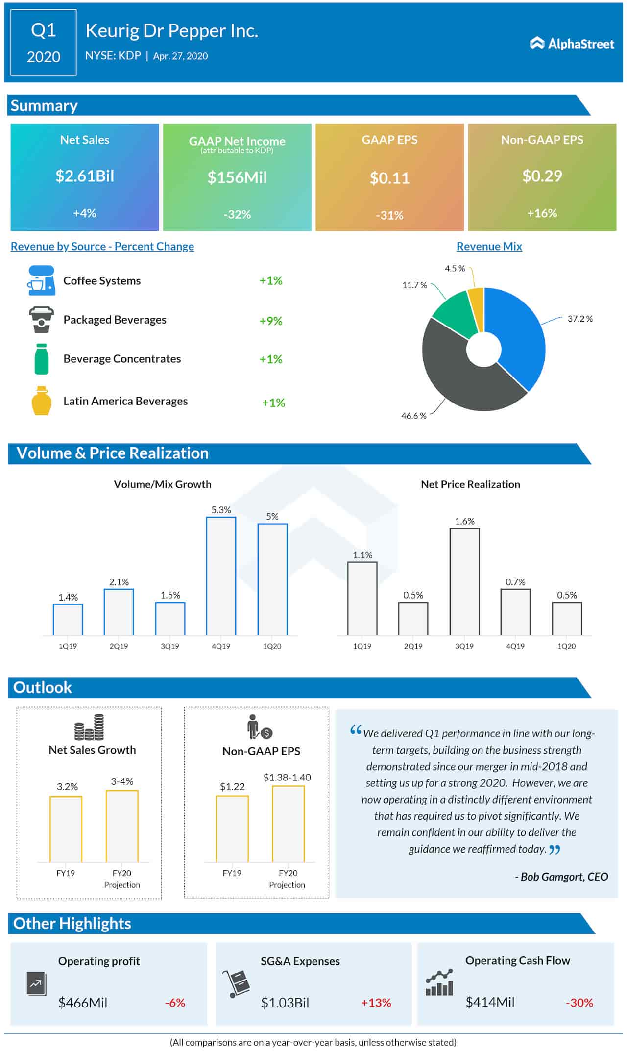 Soft drink maker Keurig Dr Pepper (NYSE: KDP) reported higher revenues and earnings for the first quarter of 2020. The company’s stock gained soon after the announcement as the results surpassed the forecast.