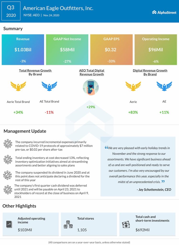 American Eagle Outfitters, Inc. (NYSE: AEO) reported third quarter 2020 earnings results today.