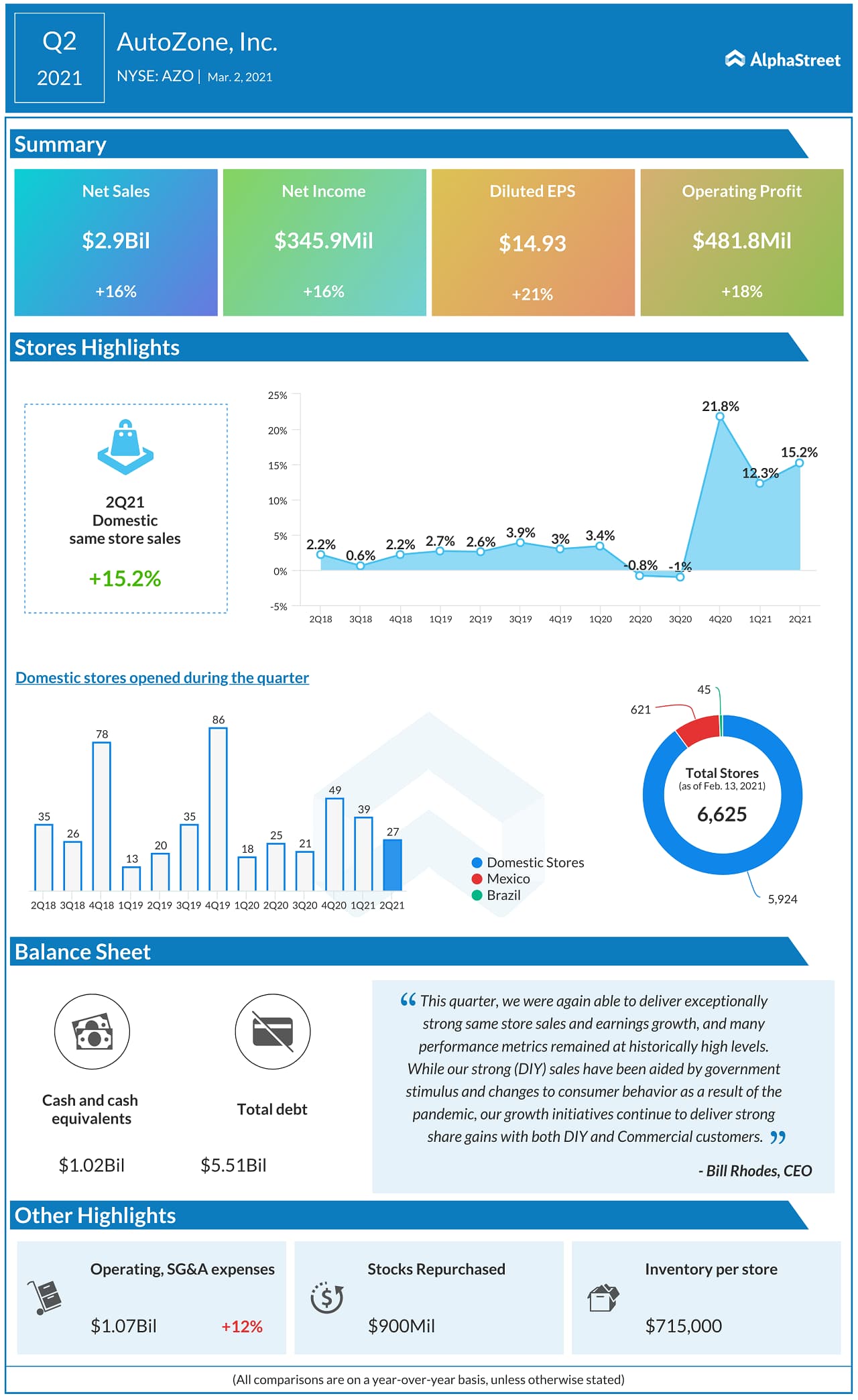 AutoZone, Inc. (NYSE: AZO) today reported its second quarter financial results for the period ended February 13, 2021.