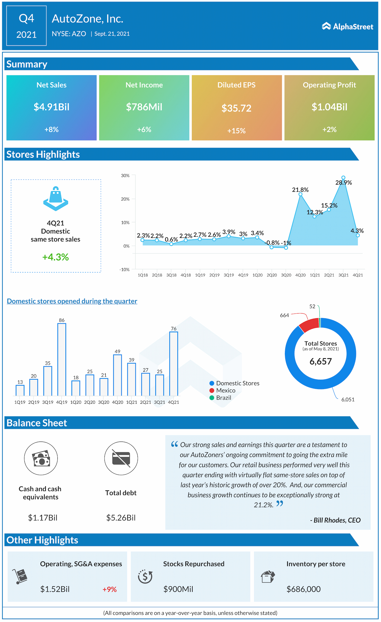 AutoZone, Inc. (NYSE: AZO) today reported its fourth-quarter financial results for the period ended August 28 , 2021.