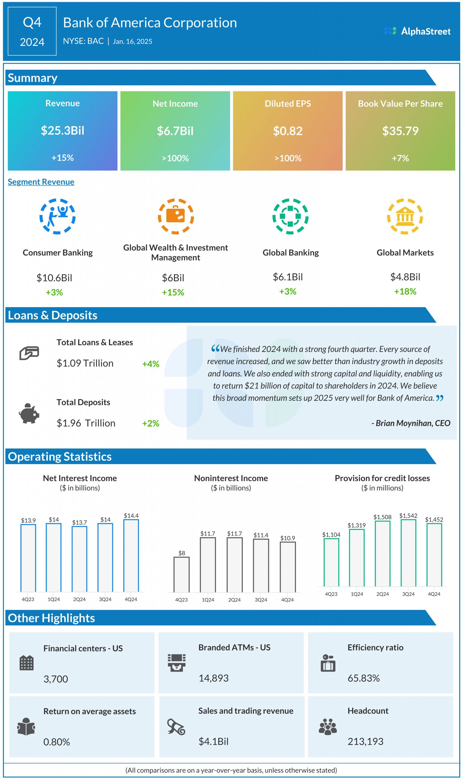 Bank of America Corporation (NYSE: BAC) reported its fourth quarter 2024 earnings results today.