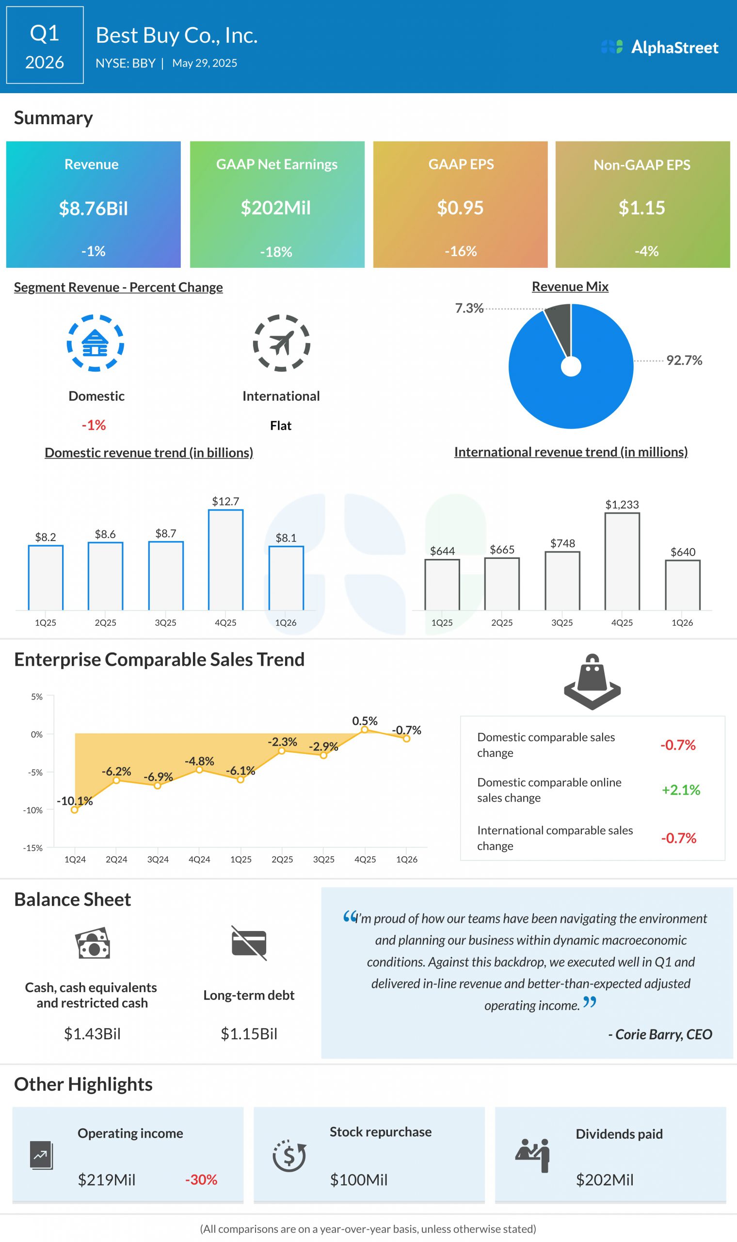 Best Buy Co., Inc. (NYSE: BBY) reported its first quarter 2026 earnings results today.