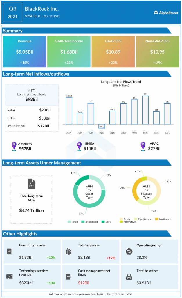 BlackRock Inc. (NYSE: BLK) reported third-quarter 2021 earnings results today. The financial services giant reported Q3 revenue of $5.05 billion, up 16% year-over-year and above the Wall Street projection. Net income of $1.68 billion or $10.89 per share was also higher than the target that analysts had anticipated.