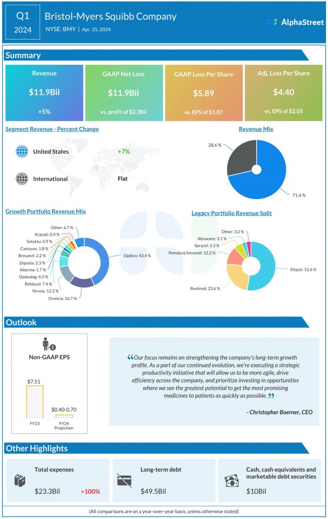 GAAP net loss attributable to Bristol Myers Squibb was $11.9 billion, or $5.89 per share, compared to net earnings of $2.3 billion, or $1.07 per share, last year. Adjusted net loss was $4.40 per share.
