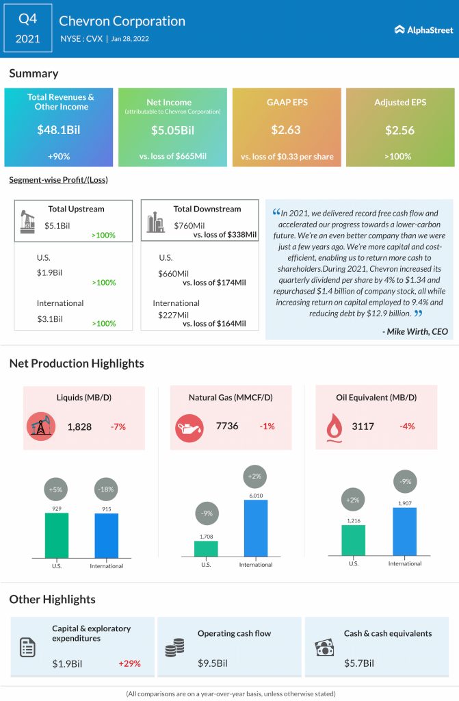 Chevron Corporation (NYSE: CVX) reported fourth-quarter 2021 earnings results today.