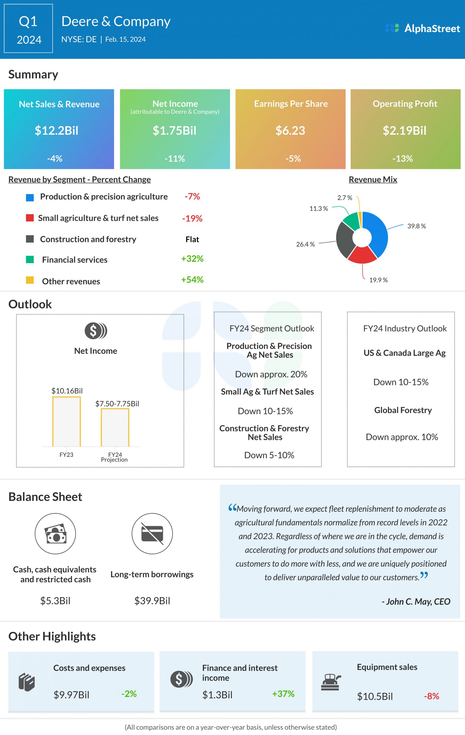 Deere & Company (NYSE: DE) reported first quarter 2024 earnings results today.