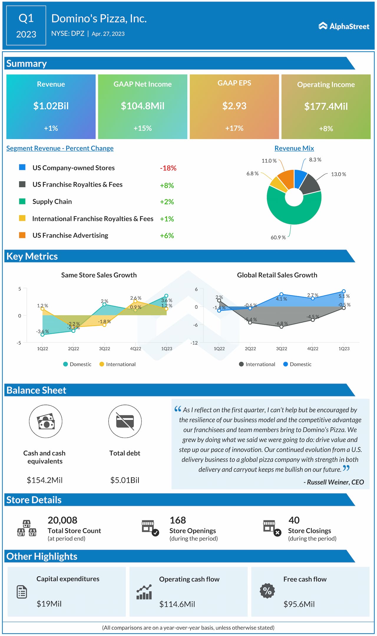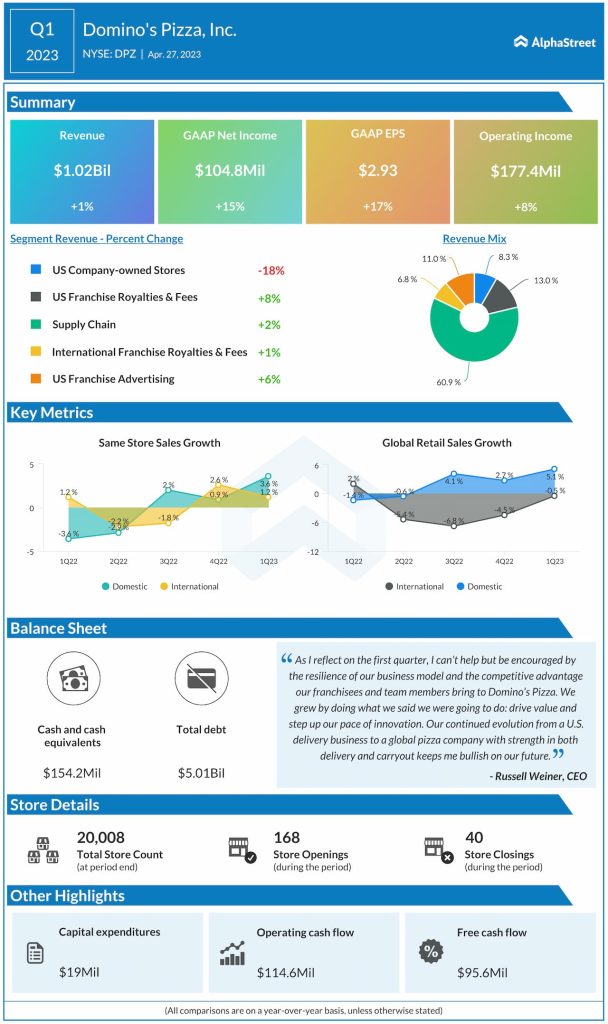 Domino’s Pizza, Inc. (NYSE: DPZ) reported total revenue of $1.02 billion for the first quarter of 2023, which was up 1.3% from the same period a year ago.
