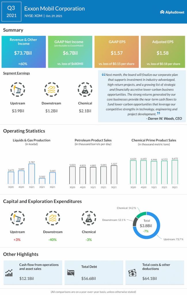 GAAP net income attributable to ExxonMobil was $6.7 billion, or $1.57 per share, compared to a net loss of $680 million, or $0.15 per share, last year. Adjusted EPS totaled $1.58.