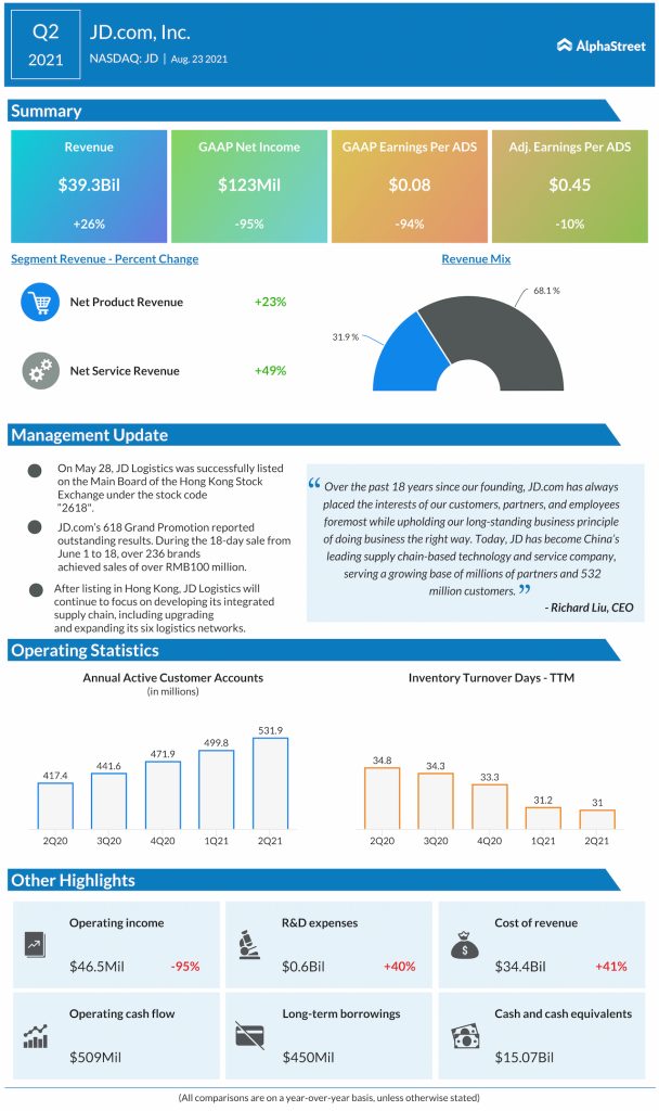 JD.com Inc. (NASDAQ: JD) reported second-quarter 2021 earnings results today.