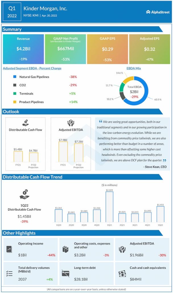 Net income attributable to Kinder Morgan Inc. was $667 million, or $0.29 per share, compared to $1.40 billion, or $0.62 per share, in the year-ago period.