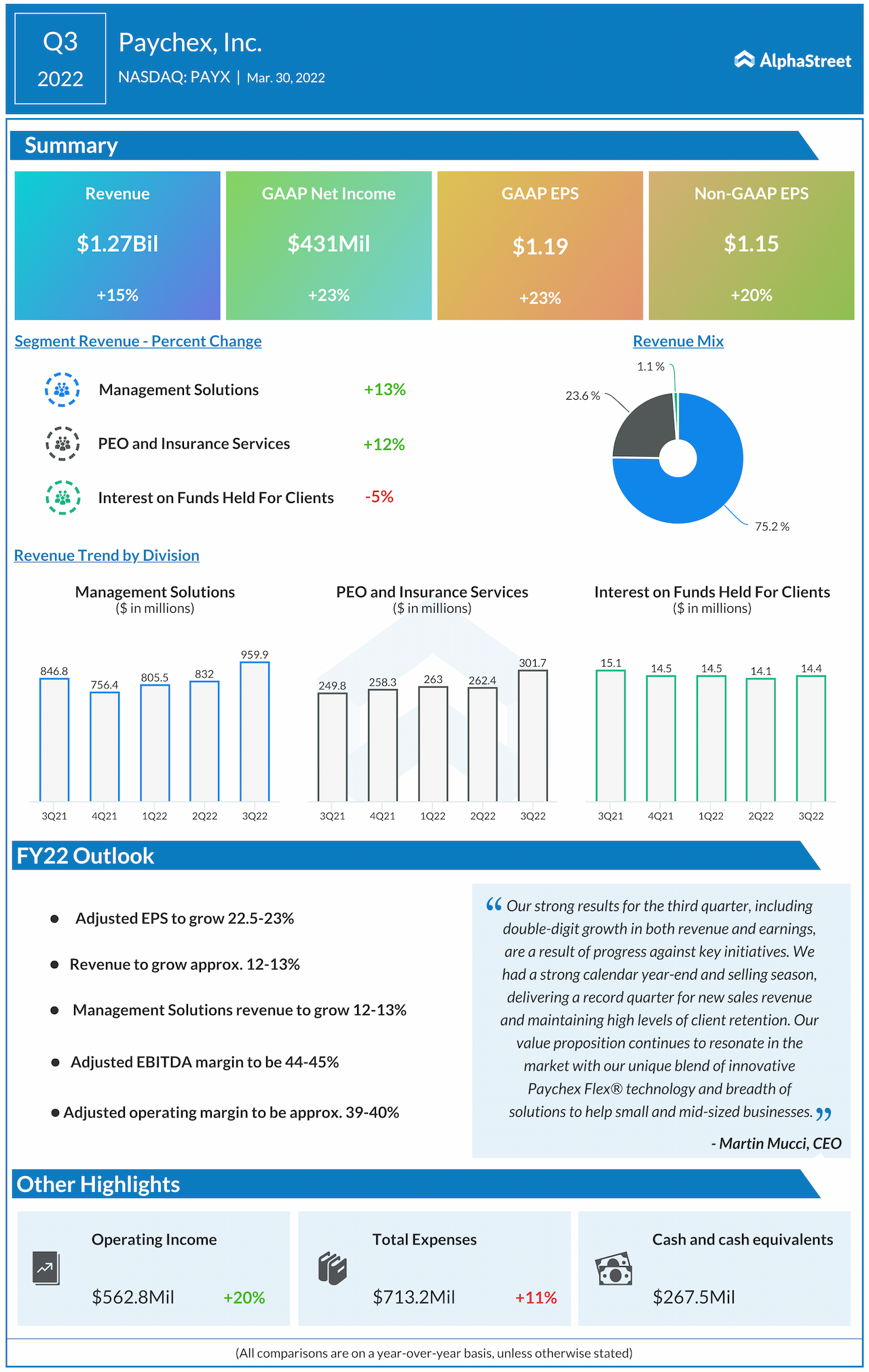 Paychex Inc. (NASDAQ: PAYX) reported third-quarter 2022 earnings results today.