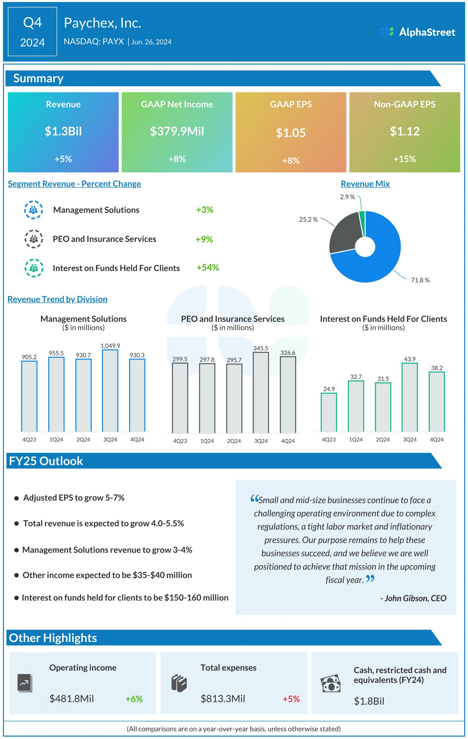 Paychex, Inc. (NASDAQ: PAYX) reported fourth quarter 2024 earnings results today.