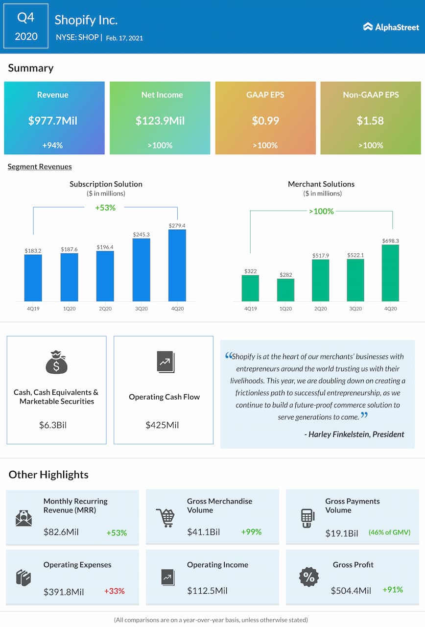 Shopify Inc. (NYSE: SHOP) reported fourth quarter 2020 earnings results today.