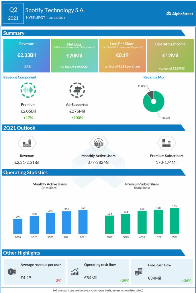 “Spotify Technology S.A. (NYSE: SPOT) reported second-quarter 2021 earnings results today. Total revenue increased by 23% year-over-year to EUR2.33 billion. Net loss attributable to owners of the parent was EUR20 million, or EUR0.19 per share, compared to the net loss of EUR356 million, or EUR1.91 per share, last year. Total monthly active users (MAU) grew […]