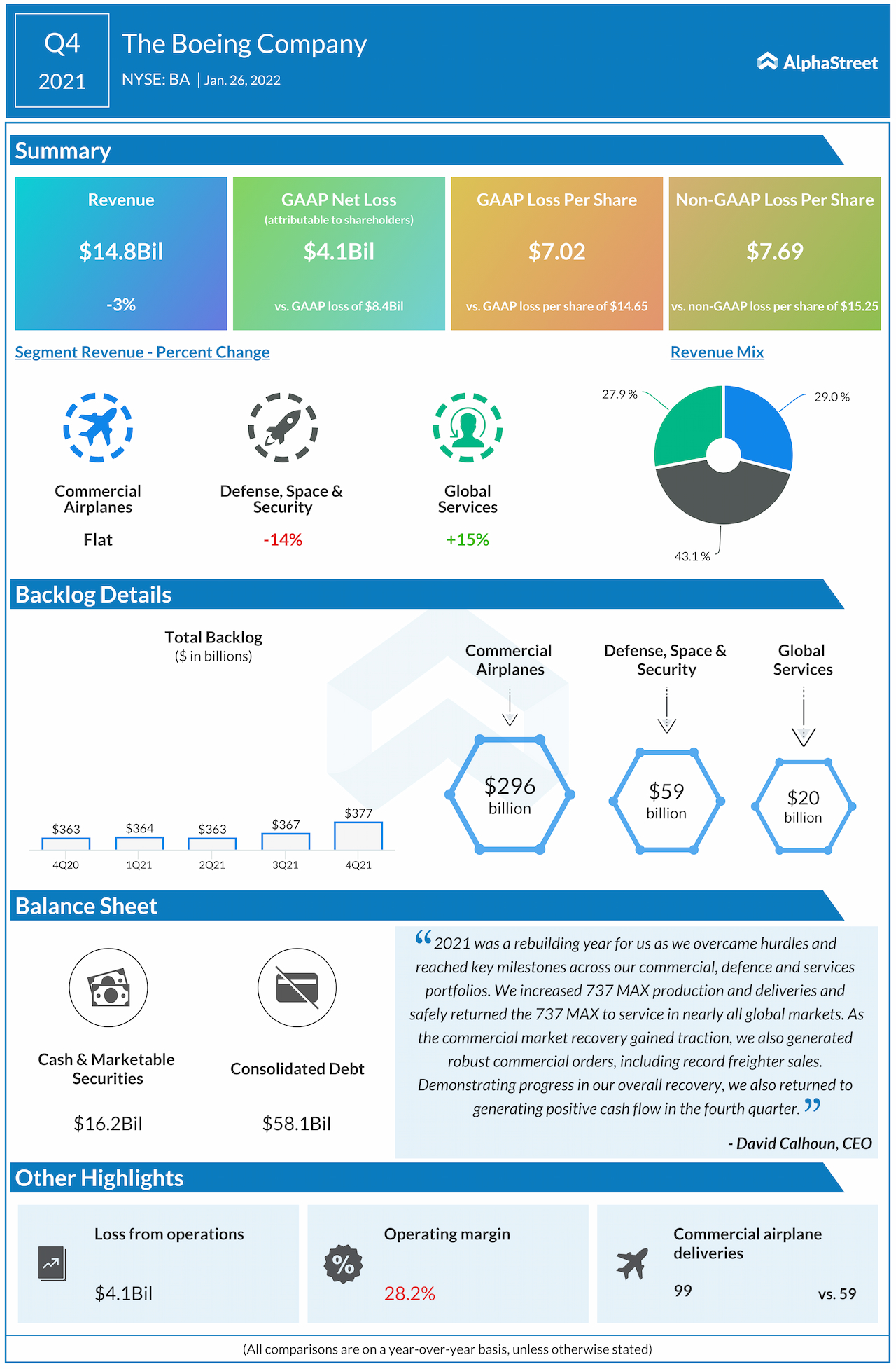 The Boeing Company (NYSE: BA) reported fourth-quarter 2021 earnings results today.