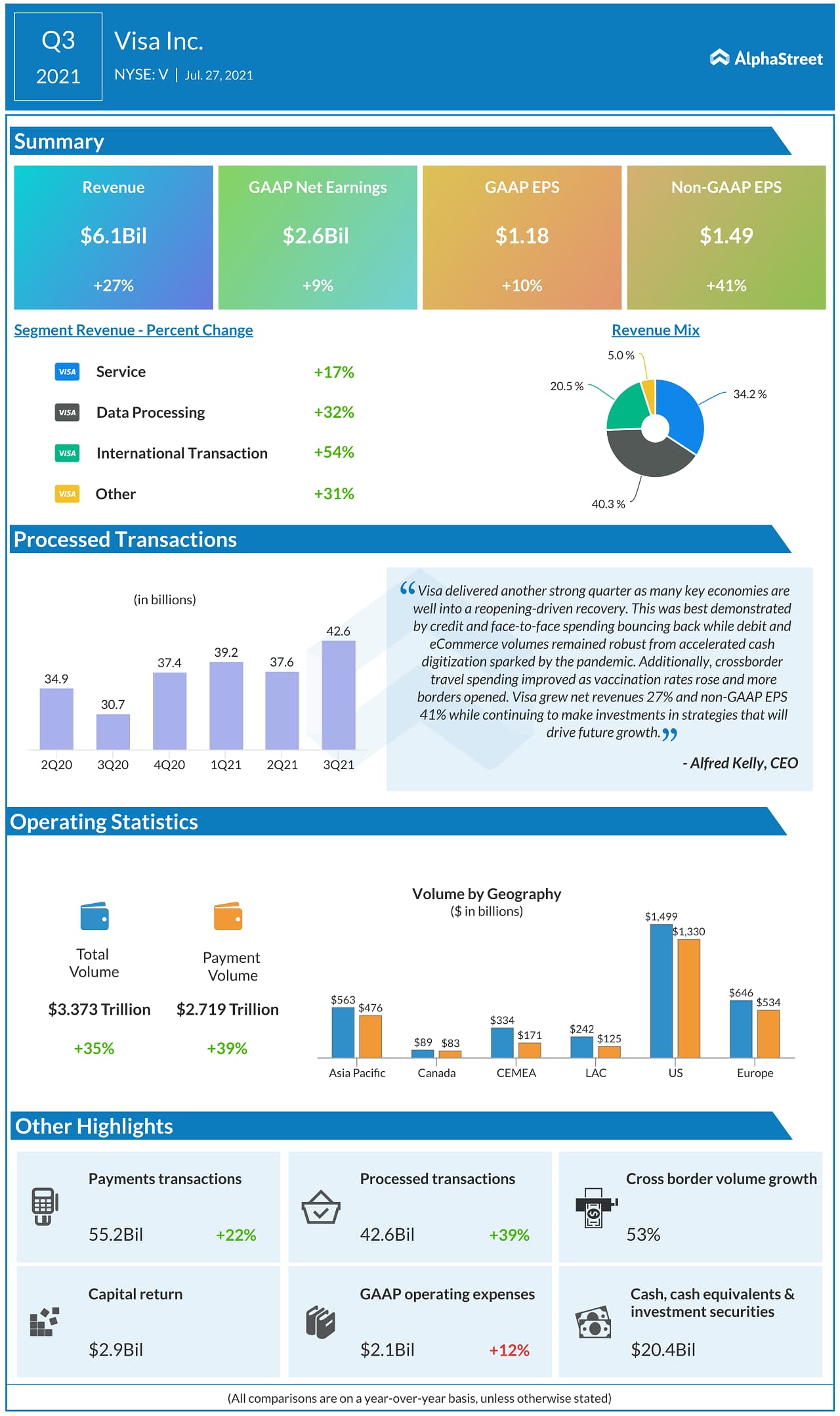 Visa Inc. (NYSE: V) today reported its third quarter financial results for the period ended June 30, 2021.