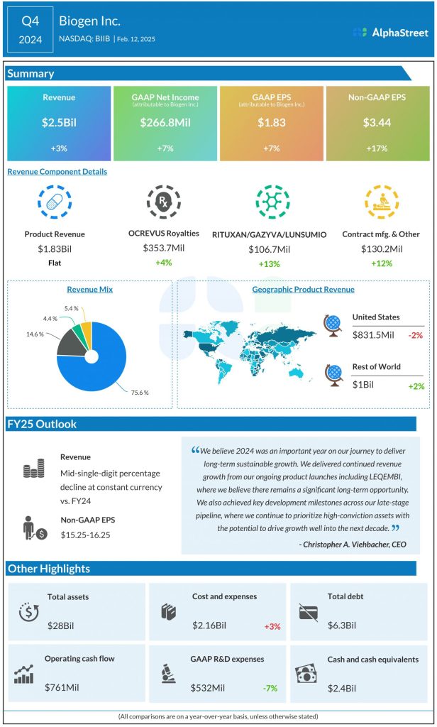 Net income attributable to Biogen Inc. was $266.8 million, or $1.83 per share, compared to $249.7 million, or $1.71 per share, last year. Adjusted EPS grew 17% YoY to $3.44.