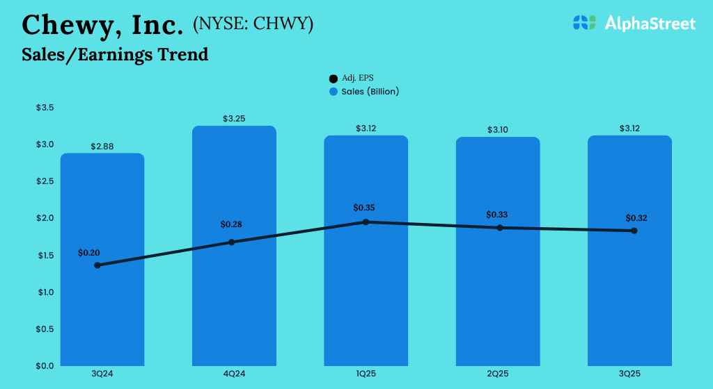Chewy, Inc. (NYSE: CHWY) reported its third quarter 2025 earnings results today.