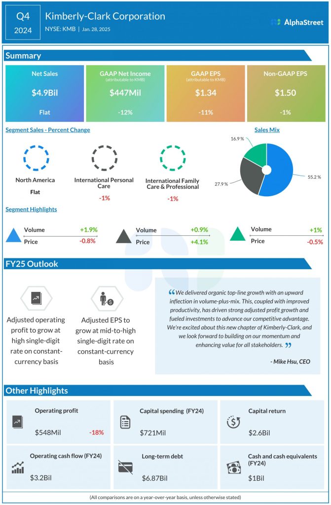 Net income attributable to Kimberly-Clark Corporation decreased 12.2% to $447 million while earnings per share dropped 10.7% to $1.34. Adjusted EPS decreased 0.7% to $1.50.