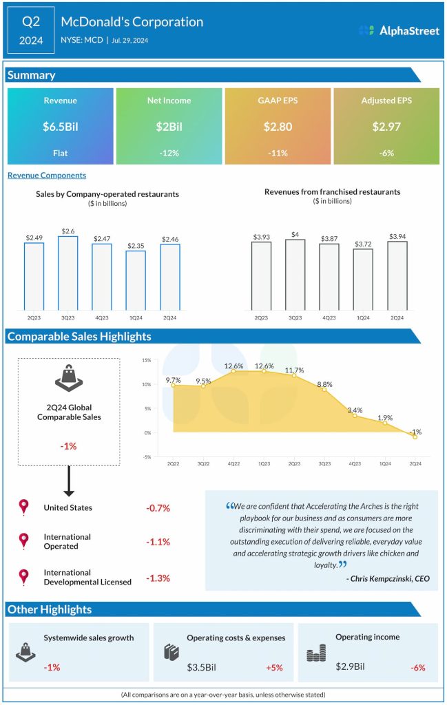 “McDonald’s Corporation (NYSE: MCD) reported its second quarter 2024 earnings results today. Consolidated revenues remained flat year-over-year at around $6.5 billion but rose 1% in constant currencies. Global comparable sales decreased 1%. Net income decreased 12% to $2 billion, or $2.80 per share, compared to last year. Adjusted EPS decreased 6% to $2.97. Systemwide […]