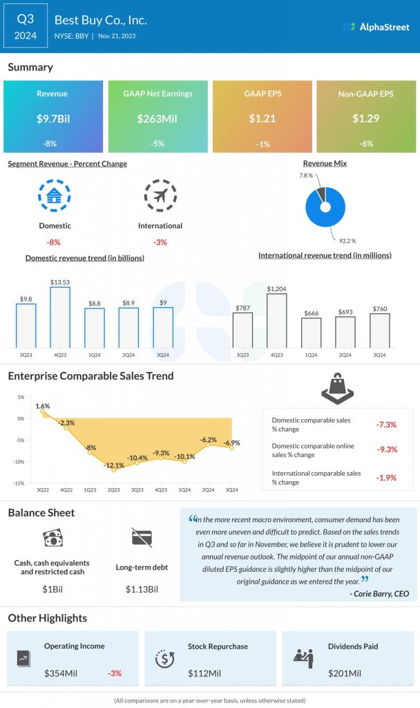 In its earnings report, Best Buy said that consumer demand has been uneven and difficult to predict and that based on the sales trends seen during the third quarter and thus far in November, the company felt it prudent to lower its annual revenue outlook.