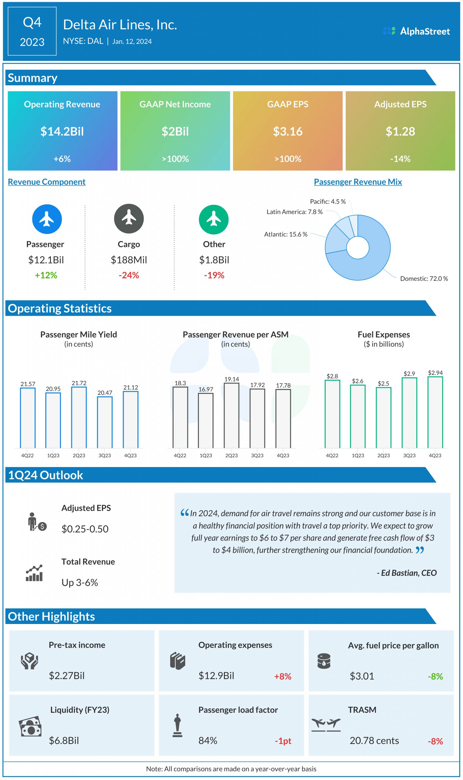 Delta reported operating revenue of $14.2 billion for the fourth quarter of 2023, which was up 6% from the same quarter a year ago and ahead of estimates of $13.5 billion. Adjusted operating revenues increased 11% to $13.7 billion. GAAP net income more than doubled from last year to $2 billion, or $3.16 per share. Adjusted EPS fell 14% year-over-year to $1.28 but surpassed projections of $1.16.