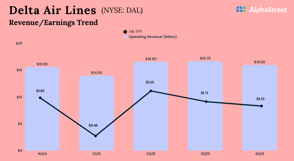 Shares of Delta Air Lines (NYSE: DAL) were down over 2% on Tuesday after the company published its fourth quarter 2025 earnings report. While the top line surpassed estimates, the bottom line matched expectations. The airline anticipates revenue growth in the upcoming fiscal year as demand remains steady.