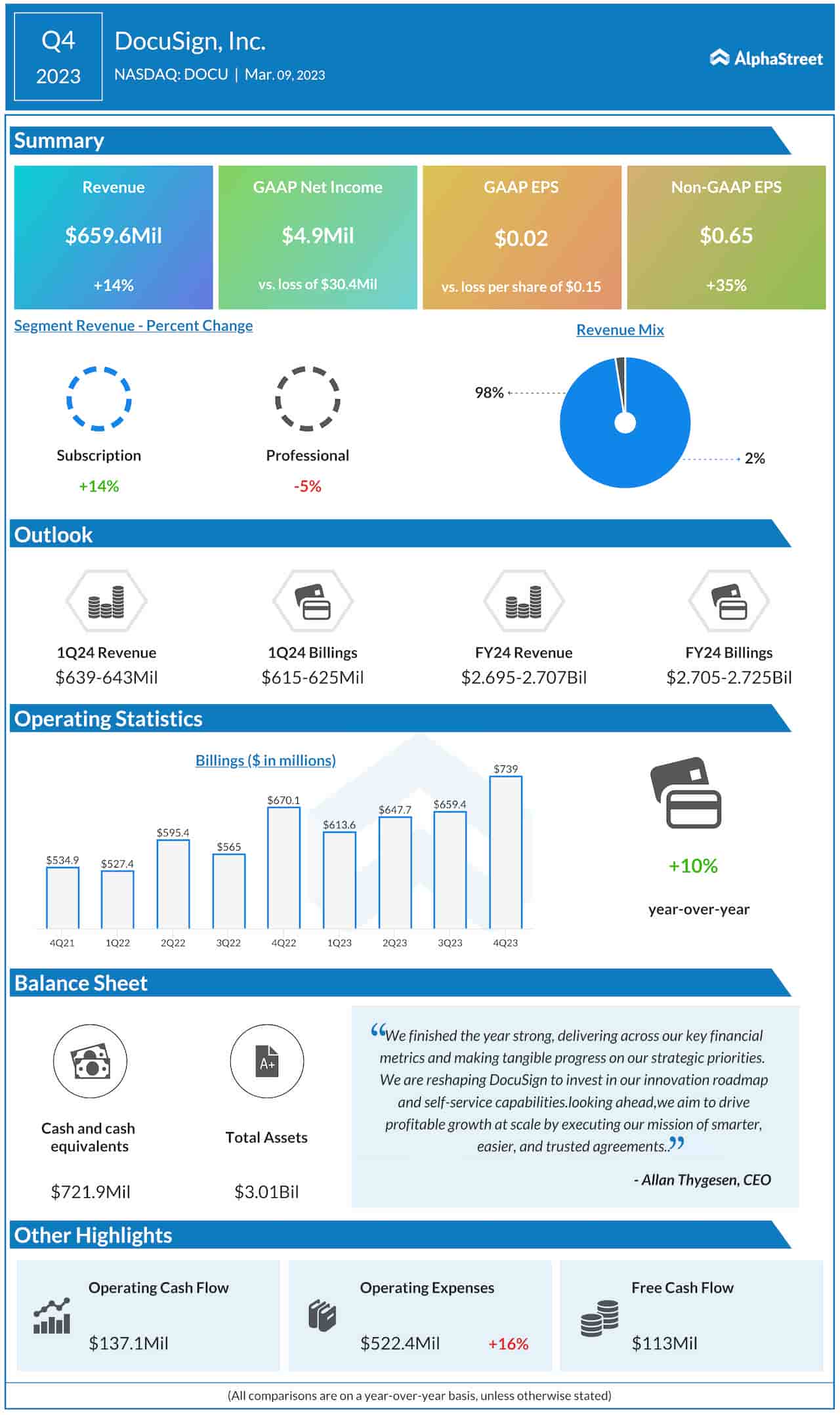 However, the macroeconomic challenges will be a hindrance to growth in the near term. Currently, DocuSign’s market capitalization is about $10.83 billion. The company’s top line grew by 14% to $659.6 million in the fourth quarter from $581 million a year earlier. Earnings per share for the quarter was $0.02, compared to a loss of $0.15 per share in the year-ago fiscal quarter. Net income of $4.9 million benefited from higher interest income, and income from other sources. Adjusted EPS was $0.65, which is sharply higher than the $0.48 reported in the same period of the previous year.