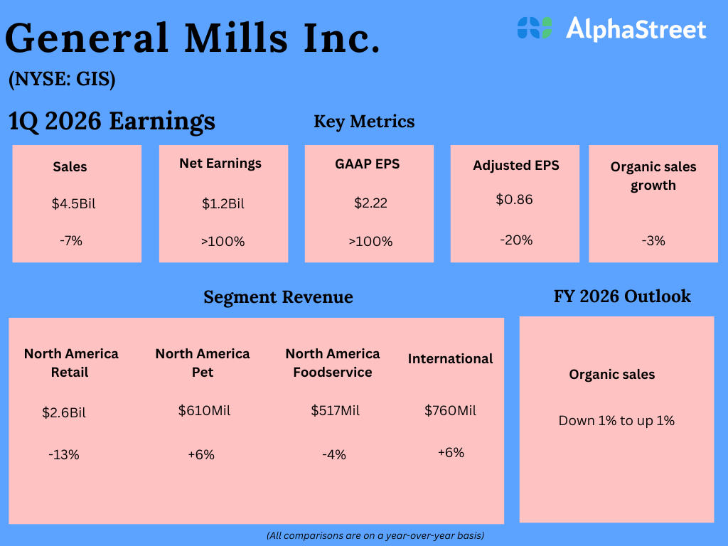 Shares of General Mills, Inc. (NYSE: GIS) stayed red on Wednesday, following the company’s announcement of its first quarter 2026 earnings results. The bottom line beat estimates while the top line matched expectations. The company anticipates a challenging consumer environment and lower-than-expected category growth in fiscal year 2026, and plans to focus primarily on restoring organic sales growth during the year.