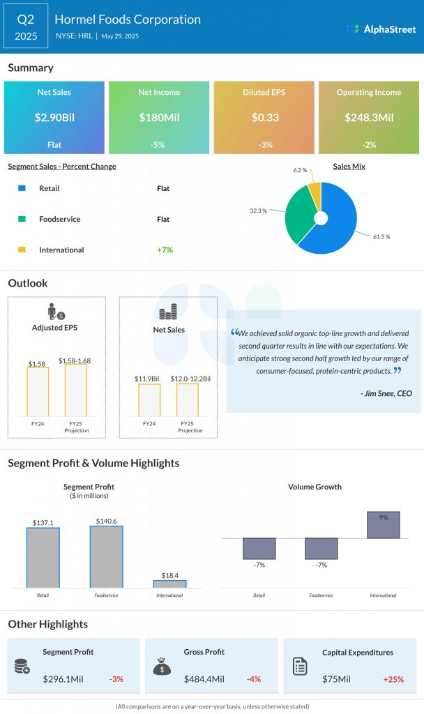 Hormel narrowed its guidance for fiscal year 2025. The company now expects net sales of $12.0-12.2 billion. Organic sales is expected to grow 2-3%, assuming growth across all segments, increased brand investments, and innovation. GAAP EPS is expected to be $1.49-1.59 while adjusted EPS is expected to be $1.58-1.68.