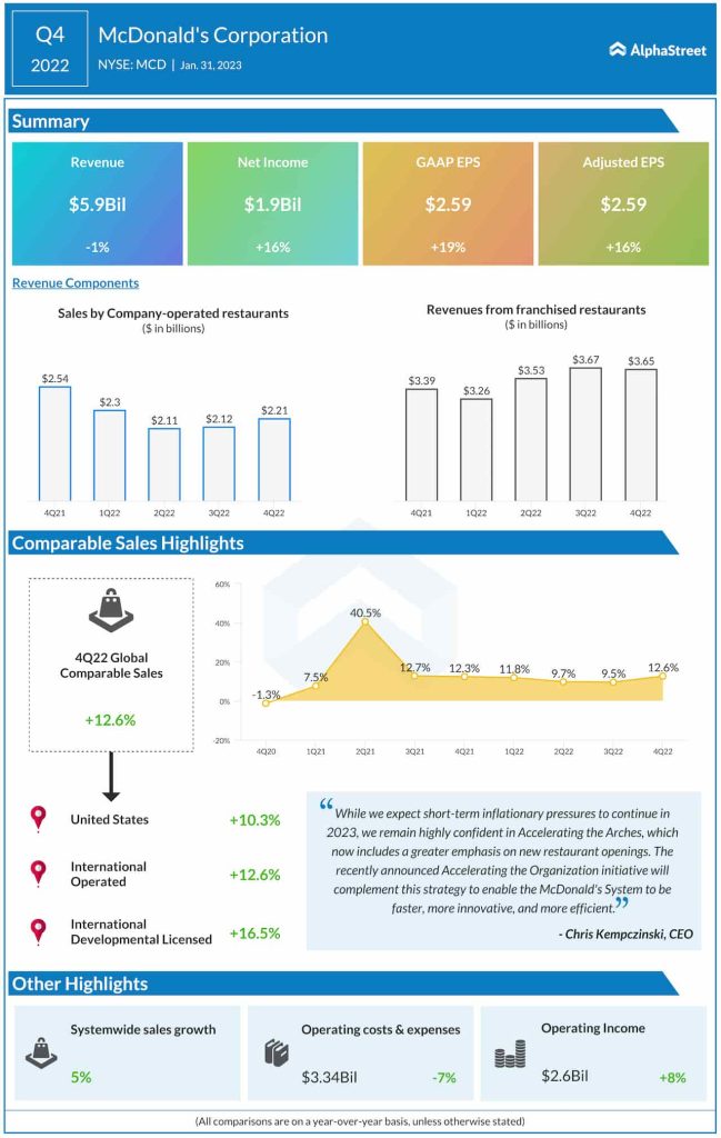 McDonald’s CEO Chris Kempczinski said, “while we expect short-term inflationary pressures to continue in 2023, we remain highly confident in Accelerating the Arches, which now includes a greater emphasis on new restaurant openings. The recently announced Accelerating the Organization initiative will complement this strategy to enable the McDonald’s System to be faster, more innovative, and more efficient. We’re proud of our continued strong performance, but we’re not satisfied.”