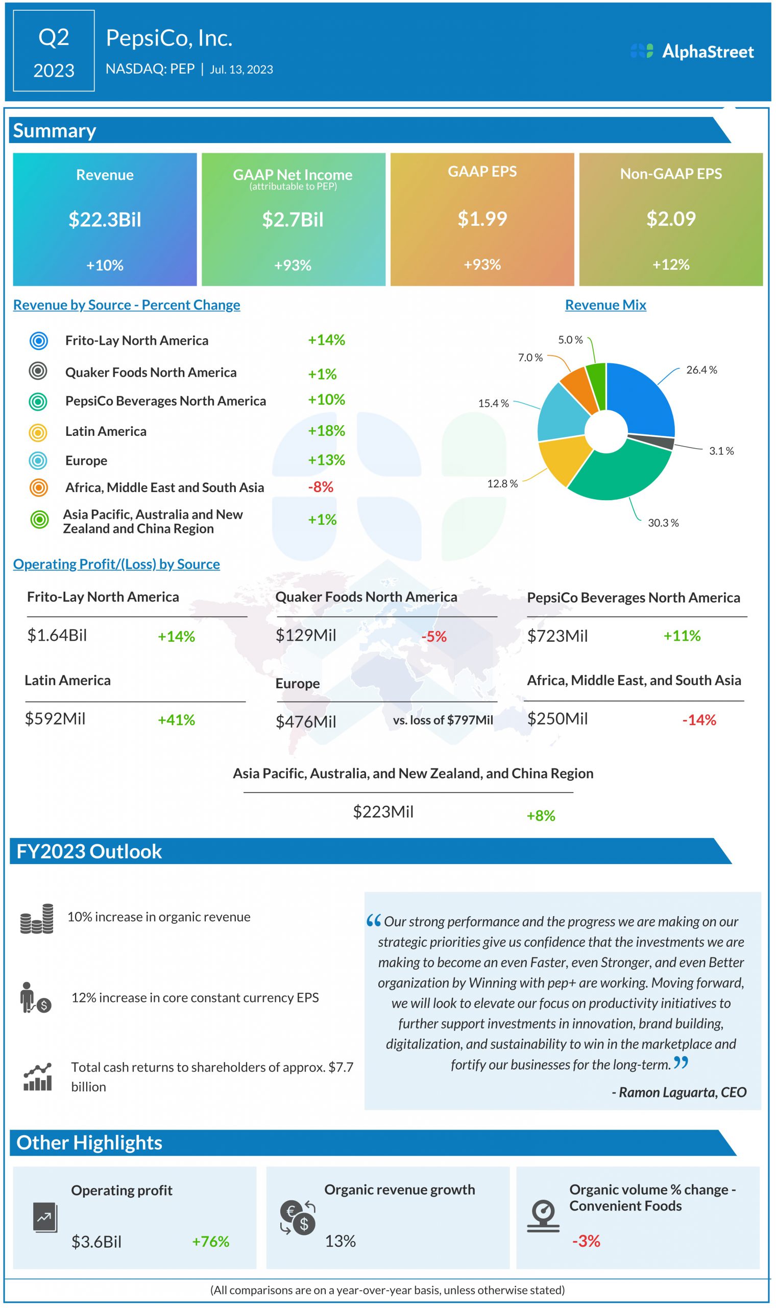 PepsiCo reported net revenue of $22.3 billion in Q2 2023, up 10.4% from the same period a year ago and ahead of estimates of $21.7 billion. Organic revenue grew 13%. GAAP EPS jumped 93% year-over-year to $1.99 while adjusted EPS rose 12% to $2.09, beating expectations of $1.95.