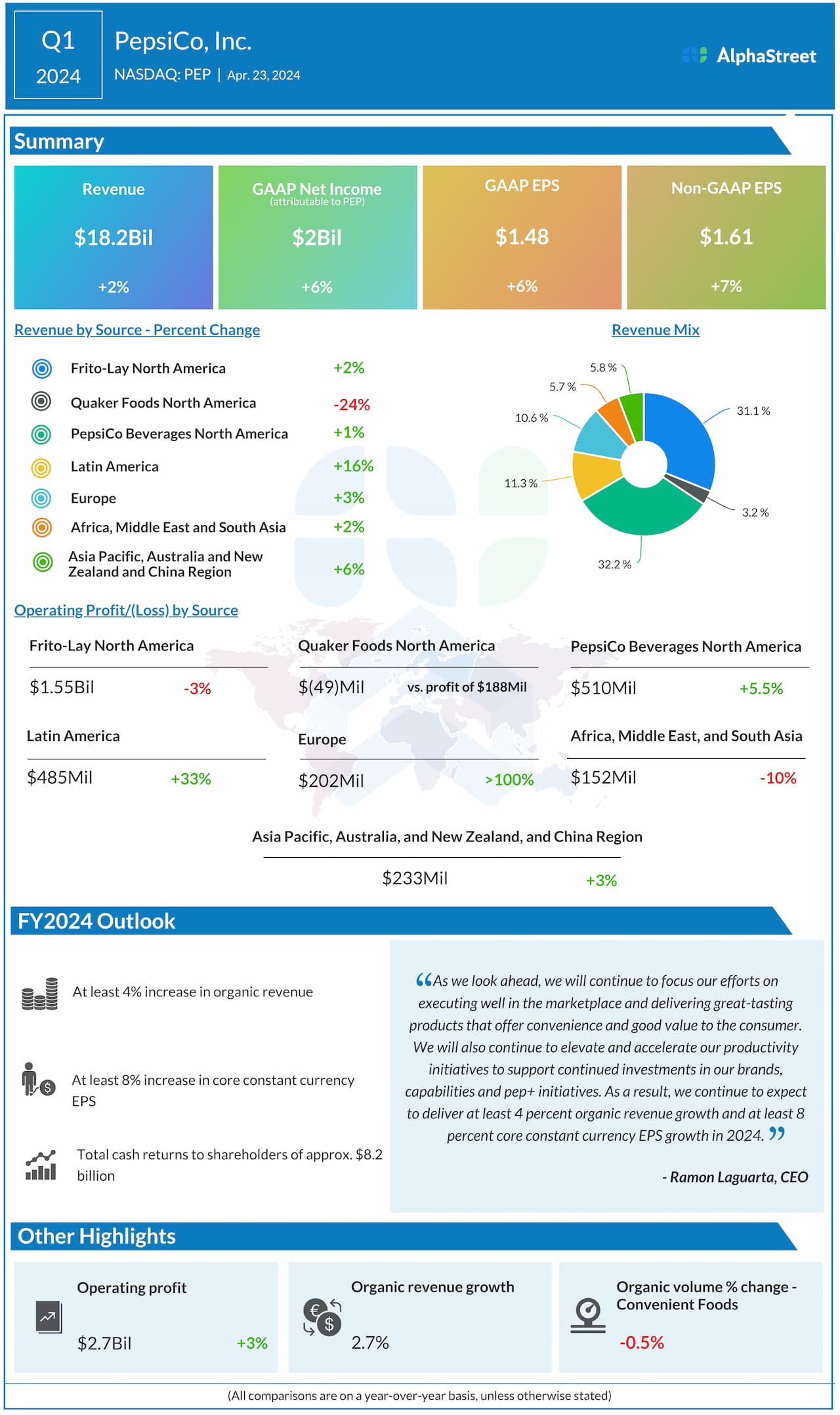 PepsiCo reported net revenue of $18.2 billion for Q1 2024, which rose 2.3% year-over-year and beat expectations of $18.1 billion. Organic revenue growth was 2.7%. GAAP net income increased 6% to $2 billion, or $1.48 per share. Core EPS grew 7% to $1.61, beating projections of $1.52.