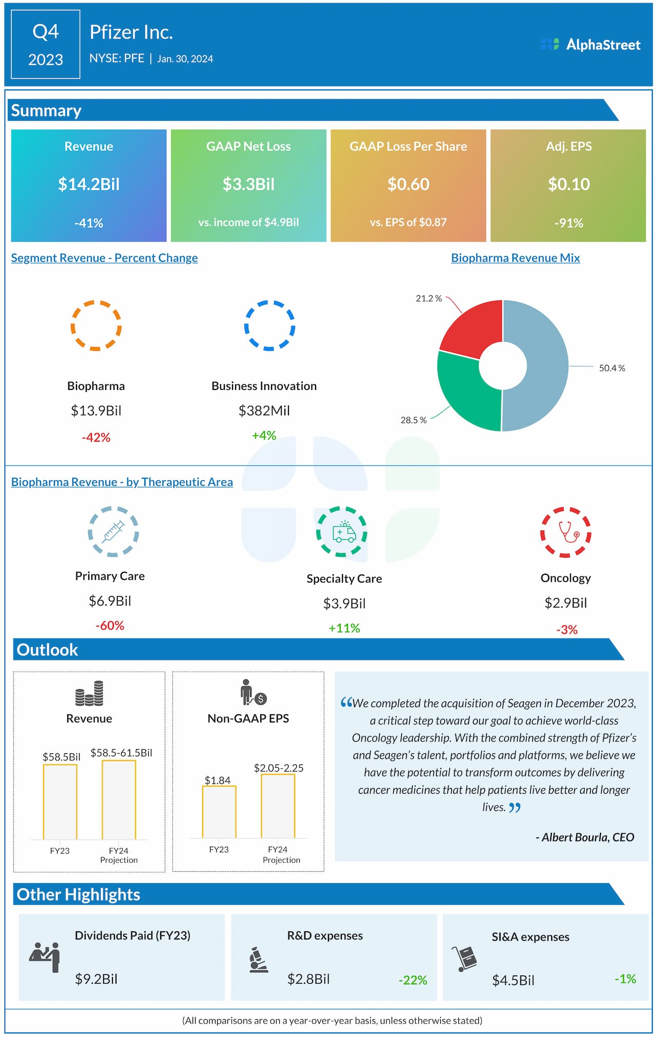 Revenues decreased 41% year-over-year to $14.2 billion in Q4 2023, missing estimates. On an operational basis, revenues were down 42%. The top line decrease was driven by a significant drop in revenues from its COVID-19 products. Excluding contributions from the COVID-19 products, revenues grew 8% operationally.