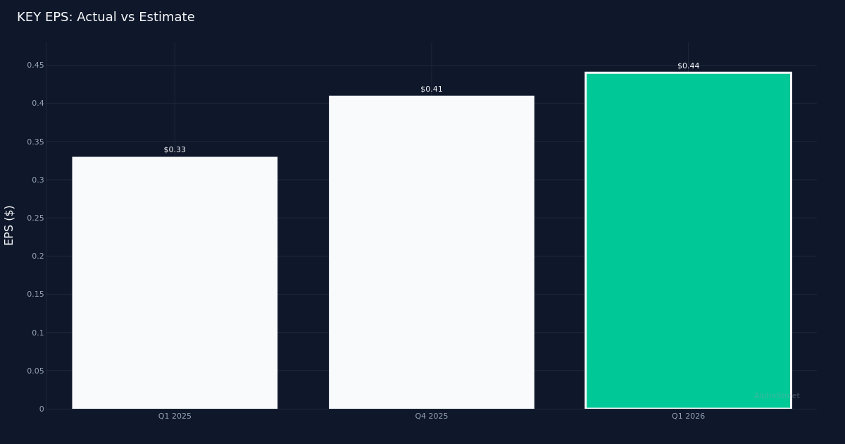 KeyCorp reported first-quarter results that topped Wall Street expectations, with the Cleveland-based banking company posting diluted earnings of $0.44 per share for Q1 2026. That surpassed the $0.41 forecast from 11 analysts, representing a beat of 7.3%. Revenue reached $1.95B, edging past the $1.94B consensus estimate by 0.7%.