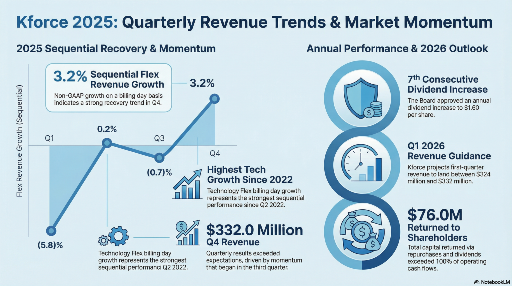 Kforce Inc. (NYSE: KFRC) reported fourth-quarter 2025 revenue of $332.0 million for the three months ended December 31, 2025, compared with $343.8 million in the same period a year earlier and $332.6 million in the prior quarter. The company said revenue declined 0.2% sequentially, while rising 3.0% on a billing-day basis, and fell 3.4% year over year. Billing days totaled 62 in the quarter, the same as a year earlier but two fewer than in the third quarter of 2025. Net income for the quarter was $5.2 million, down from $11.1 million in the prior-year period, with diluted earnings per share of $0.30 compared with $0.60 a year earlier.