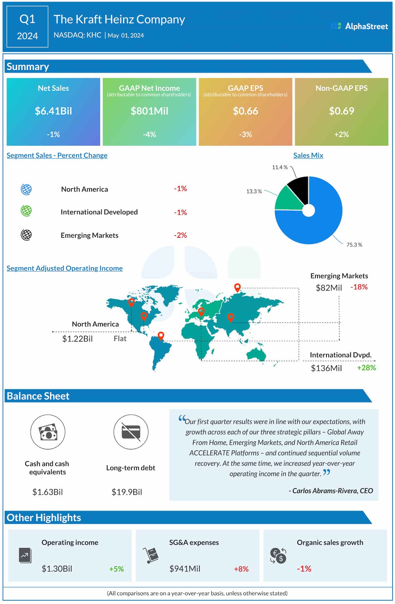 “Our first quarter results were in line with our expectations, with growth across each of our three strategic pillars – Global Away From Home, Emerging Markets, and North America Retail ACCELERATE Platforms – and continued sequential volume recovery,” said Kraft Heinz’s CEO Carlos Abrams-Rivera.