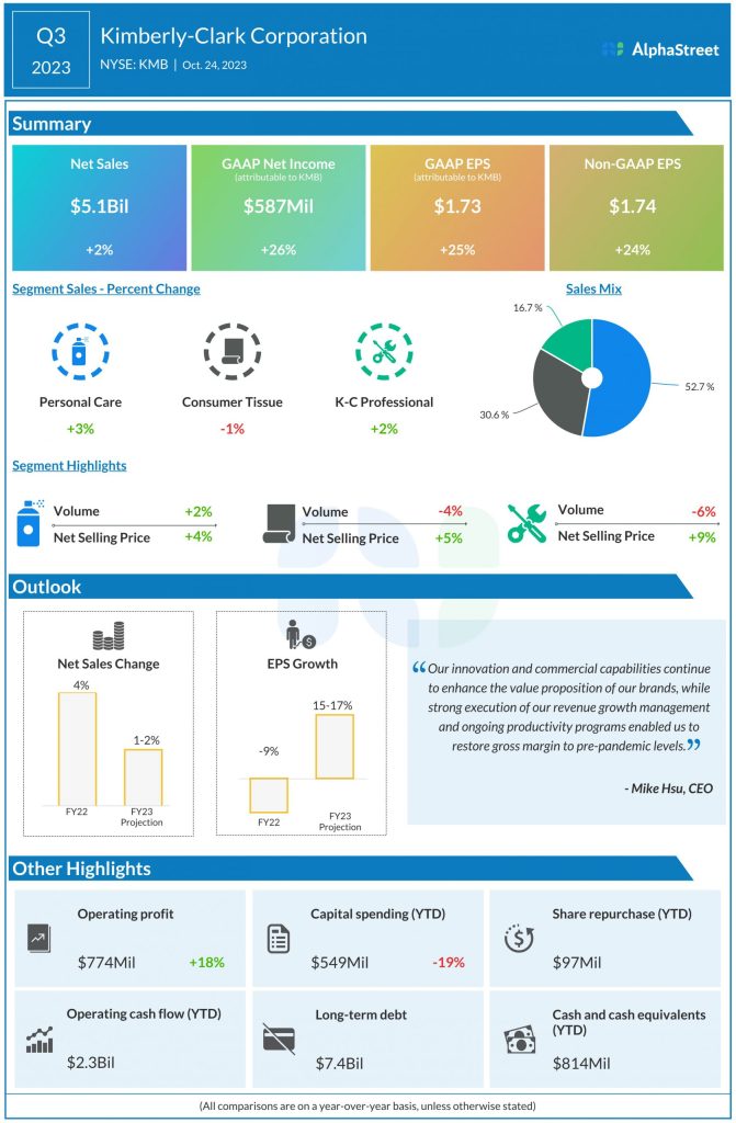 Net income attributable to Kimberly-Clark Corporation grew 26% to $587 million and EPS rose 25% to $1.73 compared to last year. Adjusted EPS rose 24% to $1.74.