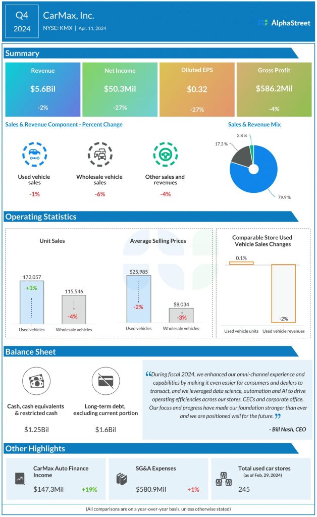 In the final three months of fiscal 2024, CarMax’s revenue decreased 1.7% from last year to $5.6 billion, mainly reflecting weakness in the core Used Vehicle segment. The weak top-line performance translated into a 27% fall in net profit to $50.3 million or $0.32 per share. Average selling prices declined both in the Used Vehicle and Wholesale Vehicle segments, continuing the recent trend. Meanwhile, used vehicle unit sales and comparable store used vehicle sales moved up 1% and 0.1% year-over-year, respectively.