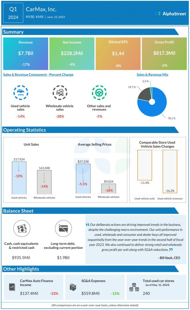 In the last two quarters, the company delivered stronger-than-expected earnings, after missing estimates for four quarters in a row earlier. In the first quarter ended May 2023, earnings declined 8% annually to $1.44 per share. At $7.7 billion, revenues were down 17% from last year and that reflects weakness across all operating segments – Used Vehicle Sales, Wholesale Vehicle Sales, and Other Sales and Revenues. Comparable store used vehicle sales and units declined in double digits.