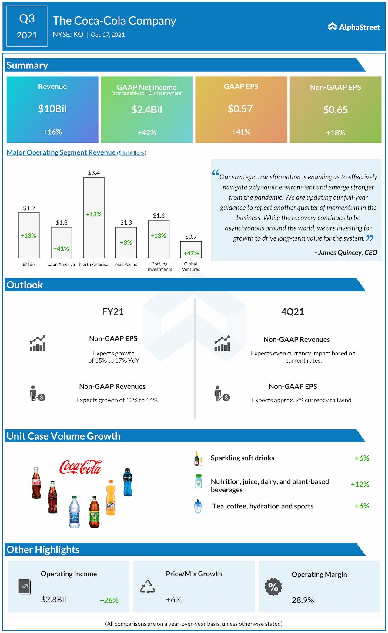 The Coca-Cola Company (NYSE: KO) reported third-quarter 2021 earnings results today.