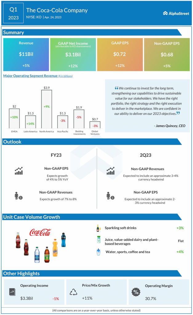 Net income attributable to shareowners of The Coca-Cola Company increased 12% to $3.1 billion, or $0.72 per share, compared to last year. Adjusted EPS grew 5% to $0.68.
