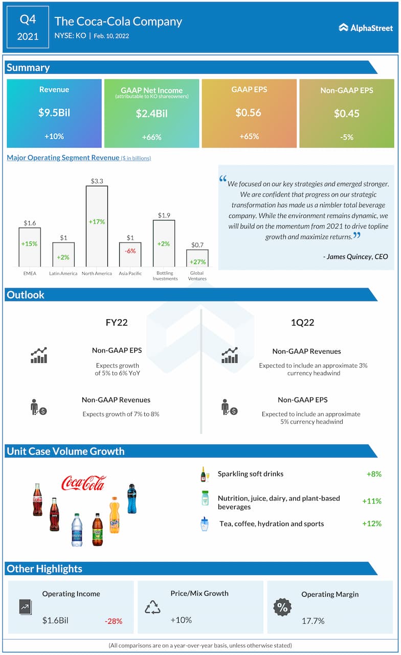 “We expect the recovery will remain asynchronous, but we are encouraged by our growing industry, our unparalleled system strength, and a strategic transformation that enables us to be agile and to adapt. Our actions drove strong results in 2021 and we have confidence in our ability to deliver another year of strong performance in 2022 and over the long-term,” said Coca-Cola’s CEO James Quincey during his post-earnings interaction with analysts last week.