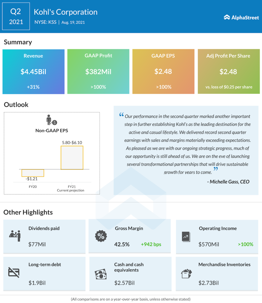 Kohl’s Corp (NYSE: KSS) reported second-quarter 2021 financial results before the regular market hours on Thursday. The department store chain reported Q2 revenue of $4.45 billion, up 31% year-over-year and higher than the Wall Street projection. Net income of $2.48 per share was also above the target that analysts had anticipated.