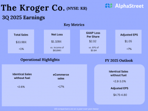 Net loss attributable to Kroger was $77 million, or $0.10 per share, compared to a net profit of $327 million, or $0.40 per share, in the year-ago period.