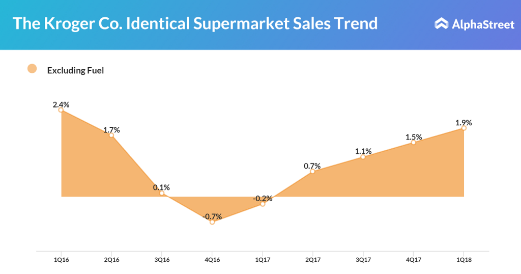 It raised the lower end of the EPS guidance to $3.64 – $3.79 from $3.59 – $3.79. Kroger also raised the bottom end of its adjusted earnings guidance to $2.00 – $2.15 per share for 2018, from $1.95 – $2.15 announced previously.