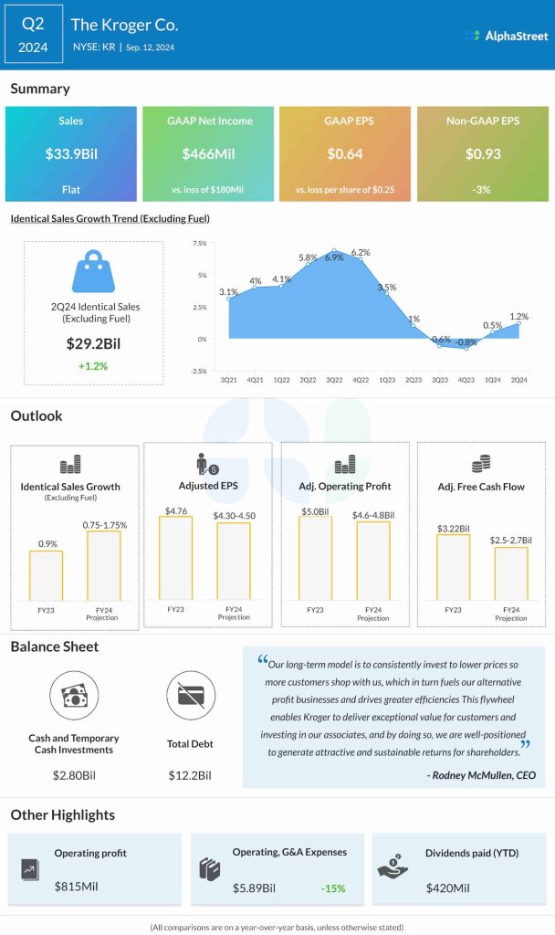 In the second quarter, identical sales rose 1.2% annually to $29.2 billion, continuing their recovery from the recent slowdown. At $33.9 billion, Q2 sales were unchanged from the year-ago period and fell short of expectations. Net income, adjusted for special items, declined 3% year-over-year to $0.93 per share during the three months. For the full fiscal year, the management forecasts adjusted earnings in the range of $4.30 per share to $4.50 per share. Identical sales, excluding fuel, are expected to grow 0.75-1.75% in FY24.